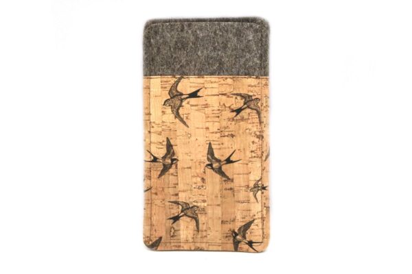 Handyhülle aus Kork und Filz, bedruckt mit Schwalben, passend angefertigt für dein Handy